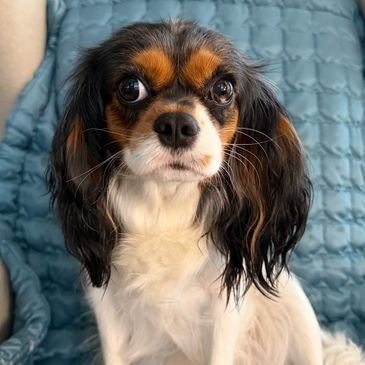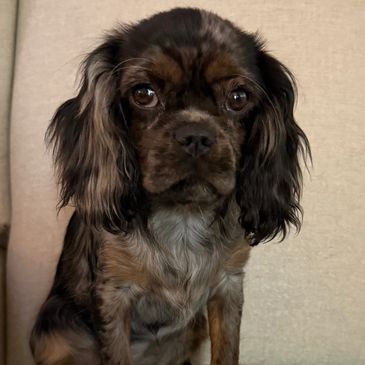 Elodie is a Tri-Color Merle, which is not an AKC recognized color, but she is 100% Cavalier King Charles Spaniel! She has a small blue mark on her left eye and just the sweetest little momma's girl.